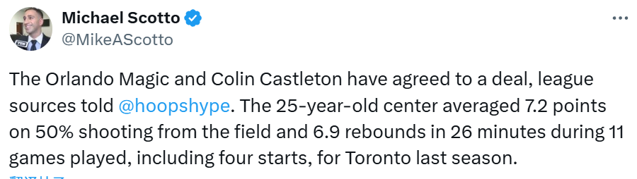 2025-08-23 06:30北京时间8月23日,据HoopsHype记者Michael Scotto报道,魔术队签下自由球员中锋科林-卡斯尔顿。