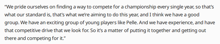 关于阵容配置,斯波也给出积极评价:“我认为我们拥有一套很棒的阵容班底,队中有像佩勒-拉松这样充满活力、让人期待的年轻球员,也有经验丰富、依旧保持极强竞争力的老将。接下来,我们要做的就是把这些优秀的‘拼图’完美整合,然后带着竞争力踏上赛场。”