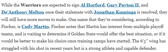 据名记Jake Fischer报道,勇士队正在考虑的引援人选之一是科迪-马丁。Fischer指出,科迪-马丁已吸引多支季后赛级别球队的关注,目前他仍在观望,一方面评估勇士能否提供最优加盟条件,另一方面也在考量,是否等到训练营开启后再做最终决定会更合适。
