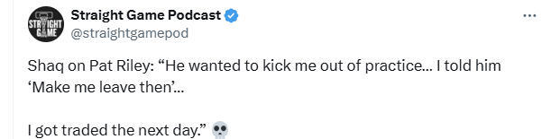 奥尼尔说道:“他(莱利)身上总带着一个钟,有一次杰森-威廉姆斯训练迟到了,虽然只迟到半秒钟,但莱利就说‘嘿,哥们,滚出去’。我告诉威廉姆斯,我们不会这样对你,要知道当时他刚送走了安托万-沃克和其他队友,整个队伍输得很惨。所以他让威廉姆斯滚出去的时候,我就说不可能,他不会走的。莱利就说:‘那你就替他滚蛋。’我反怼道:‘有种你就交易我啊。’然后我们发生了冲突,第二天我就被交易走了。”