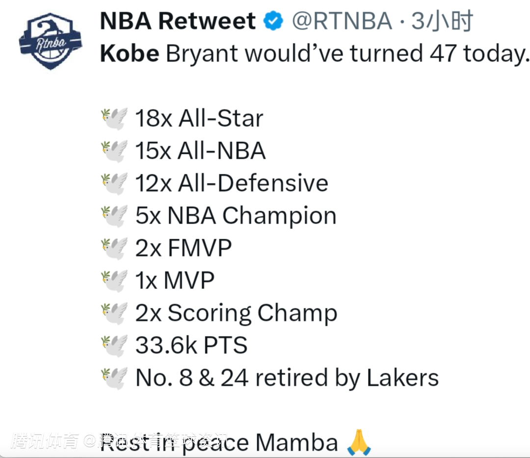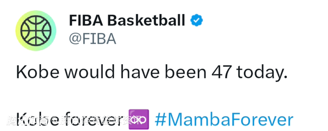 FIBA官方配文写道:科比今天本应该47岁,科比永存,曼巴精神永存。