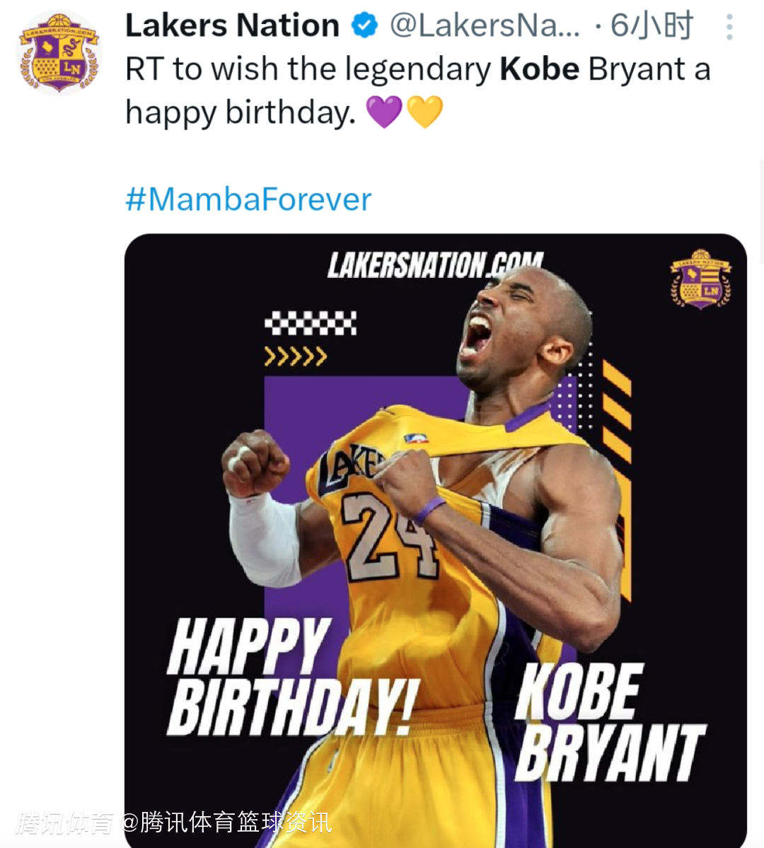 Lakers Nation配文写道:祝福传奇人物科比生日快乐