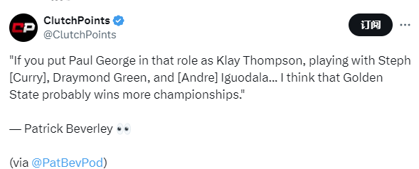 贝弗利说道:“要是把保罗-乔治放到克莱-汤普森的位置上,让他和斯蒂芬-库里、德雷蒙德-格林以及安德烈-伊格达拉一起打球……我认为金州勇士队或许能赢得更多总冠军。”