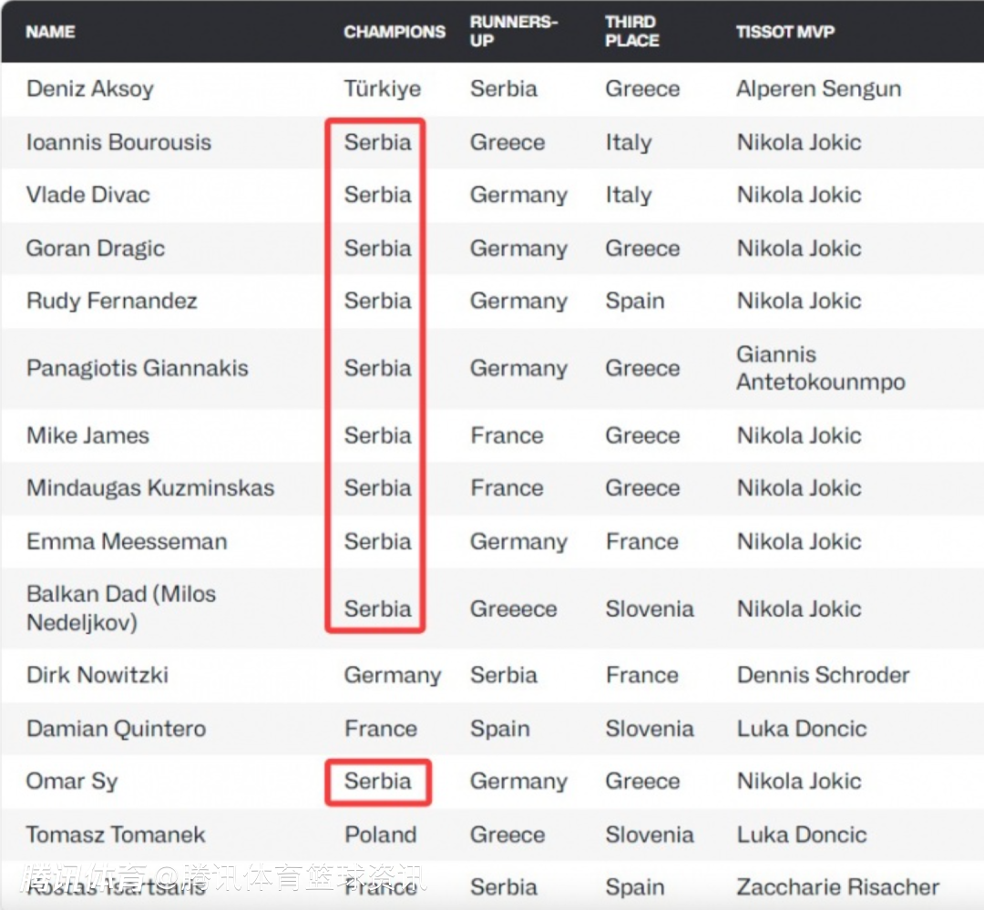 看好塞尔维亚夺冠的,包括迪瓦茨、博洛西斯、德拉季奇、鲁迪-费尔南德斯、迈克-詹姆斯、库兹明斯卡斯等人,而诺维茨基则看好祖国德国夺冠,且德国球星施罗德拿到赛会MVP。