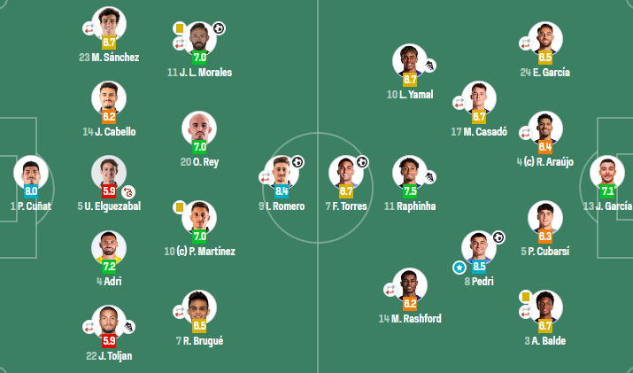 巴塞罗那(4-2-3-1):霍安-加西亚;埃里克-加西亚,阿劳霍(76'克里斯滕森),库巴西,巴尔德(76'莱万多夫斯基);卡萨多(46'加维),佩德里;亚马尔,拉菲尼亚,拉什福德(46'奥尔莫);费兰-托雷斯