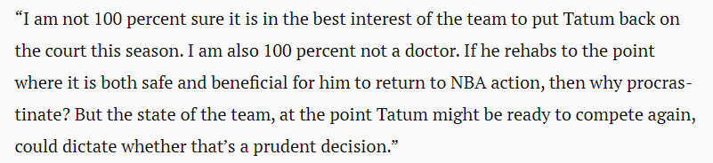 “我并不完全确定,让塔图姆在新赛季重返赛场是否符合球队的最大利益,当然,我也绝非专业医生。如果他的康复进展能达到既安全、又对其回归NBA赛场有益的程度,那为何还要拖延呢?但届时球队的整体状况,可能会决定让他复出是否是一个审慎的选择。”