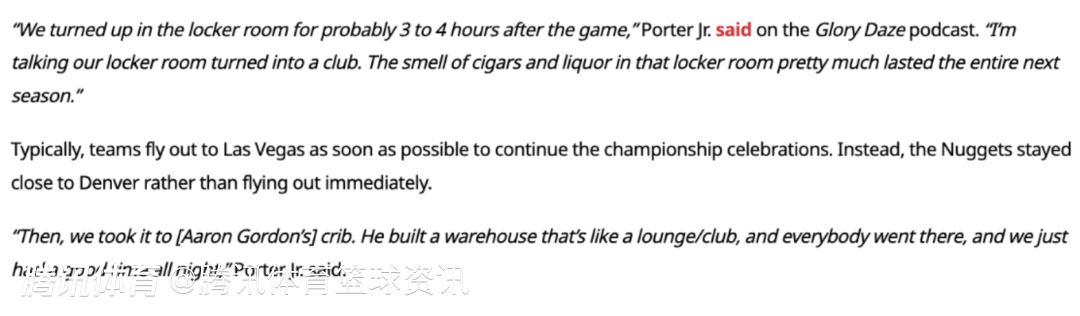 通常情况下,球队会尽快飞往拉斯维加斯,继续总冠军庆祝活动,但掘金队没有立刻飞走,而是留在了丹佛附近。“然后,我们去了阿隆-戈登的住处。他弄了一个像休闲酒吧、夜店的仓库,大家都去了那儿,我们彻夜狂欢”小波特继续说道。