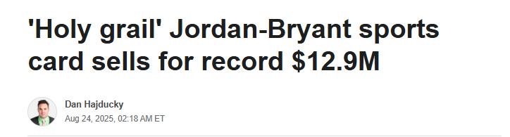 2025-08-24 16:00北京时间8月24日,据ESPN报道,一张乔丹和科比的签名球星卡最终以1293.2万美元的价格售出,打破了球星卡的最高售价纪录。