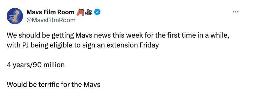 Mavs Film Room在社媒写道:“4年9000万,这对独行侠来说会很棒。”