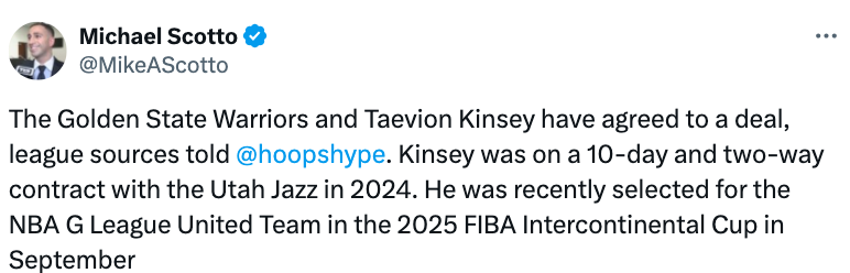 2025-08-24 23:40北京时间8月24日,据名记Scotto报道,勇士已经和泰维昂-金西达成签约协议,这也是勇士今夏引援的首笔操作。