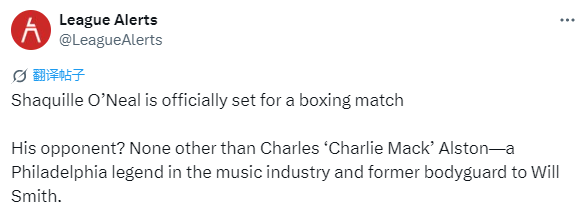 2025-08-25 06:10北京时间8月25日,据美国媒体League Alerts报道,NBA传奇巨星奥尼尔已正式同意,与费城知名人士、曾担任威尔-史密斯保镖的查尔斯-奥尔斯顿展开一场名人拳击赛。