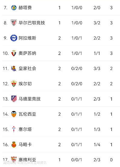 7-17:赫塔菲、毕尔巴鄂竞技、阿拉维斯、奥萨苏纳、皇家社会、埃尔切、马竞、瓦伦西亚、塞尔塔、马略卡、塞维利亚;