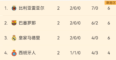 1-4:比利亚雷亚尔、巴萨、皇马、西班牙人;