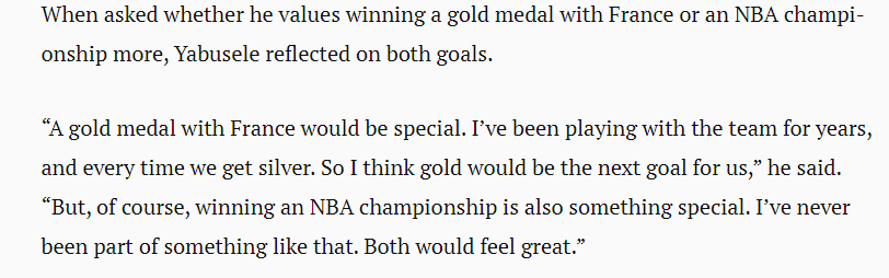 当被问及更看重与法国队一同赢得奥运金牌,还是获得NBA总冠军时,亚布塞莱说:“能和法国队一起夺得奥运金牌会很特别。我已经为国家队效力多年,此前每次参赛我们都只拿到银牌,所以我认为金牌会是我们接下来的首要目标,不过,赢得NBA总冠军当然也意义非凡,我还从未有过这样的经历。无论实现哪一个目标,都会是很棒的体验。”