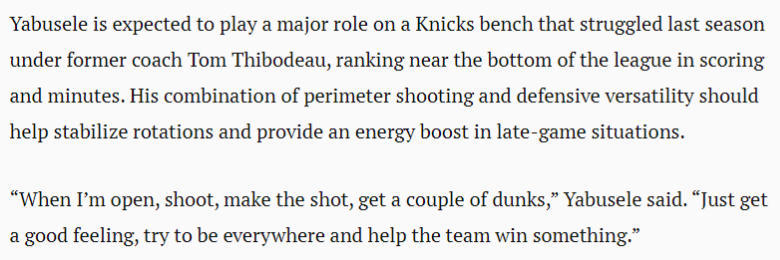 亚布塞莱还表示,自己很渴望为尼克斯队效力。他说道:“首先,你能明显感受到他们队员之间有着特殊的凝聚力,当他们一同踏上赛场时,那种求胜欲仿佛要击败对手。他们在季后赛中已经走得很远了,而且年复一年,你能看到他们的进步。对我来说,渴望成为这支队伍的一员是很自然的想法。要知道,尼克斯的主场球迷可是联盟中最挑剔的群体之一,这一点人尽皆知。”