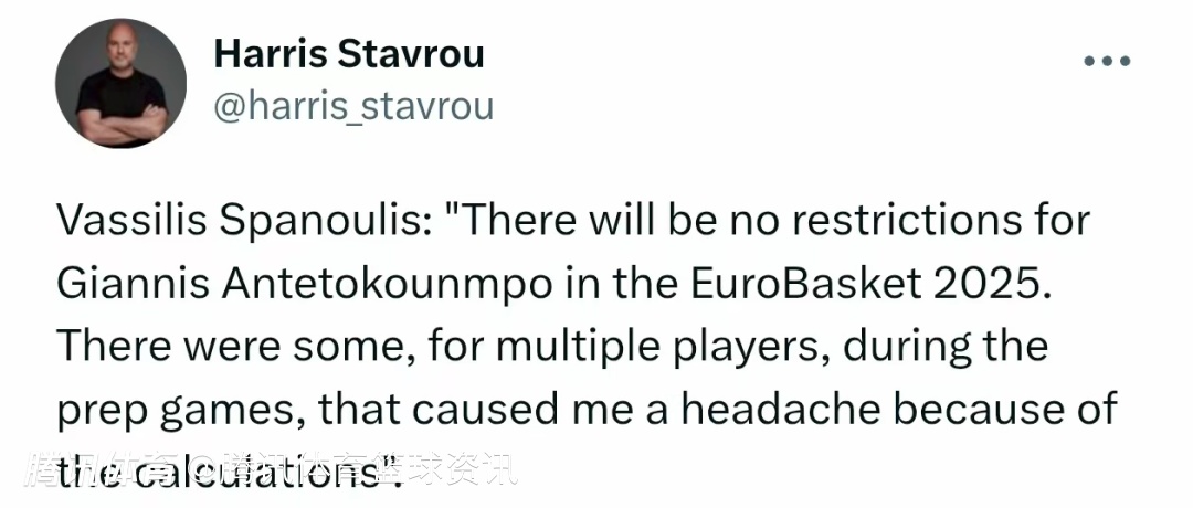 斯潘诺里斯明确表示:“2025年欧锦赛正赛期间,字母哥将不会受到任何出场时间限制。不过在之前的热身赛阶段,队里曾有多名球员存在出场限制,这让我非常头疼。因为需要反复计算每位球员的上场时长,对排兵布阵影响很大。”