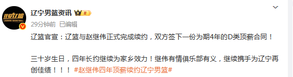 2025-08-25 17:50北京时间8月25日,根据辽宁男篮官方社交媒体公示,我俱乐部与球队核心后卫赵继伟签下一份为期4年的D类顶薪合同,引发外界的热议,这也大概率是赵继伟CBA职业生涯最后一份长约,4年之后,赵继伟将会获得签下老将合同的资格。