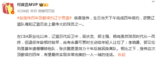 赵继伟4年顶薪续约引热议!辽宁官方盛赞队史最伟大的球员之一