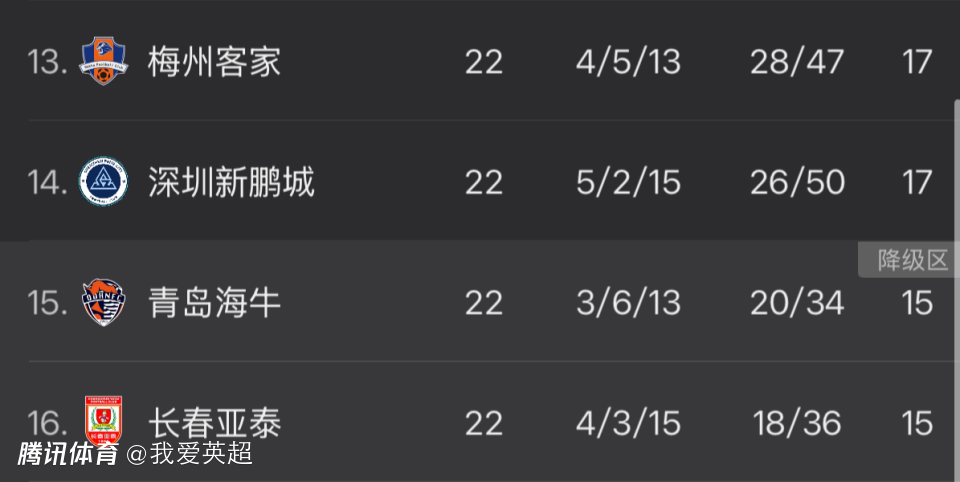 中超保级形势在本轮过后更加混乱。亚泰1-0击败新鹏城,取得保级大战两连胜的同时送对手5连败,虽然仍排名垫底,但亚泰距离安全区只有2分差距。梅州客家2-2战平浙江队,也拿到了宝贵的一分,中超后四名只差2分。