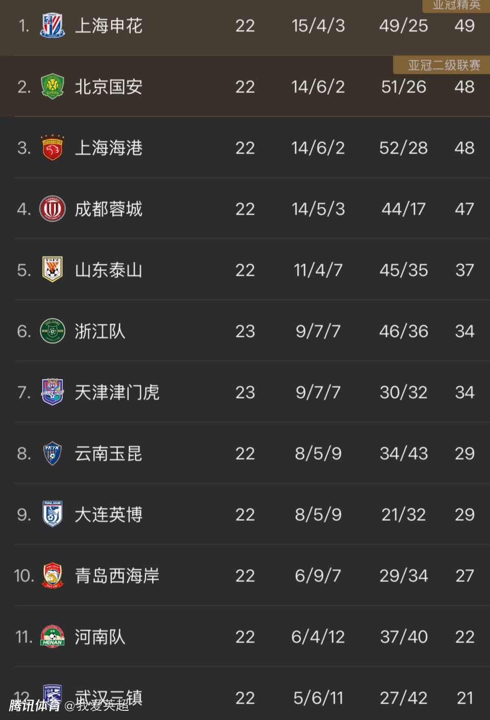 此外,泰山本轮3-2力克青岛西海岸,在”争五“的较量中取得了3分的领先优势。浙江和津门虎同积34分紧随其后。云南玉昆和大连英博因为近期糟糕的表现,已经被拉开分差,两队同积29分排名第8和第9位。