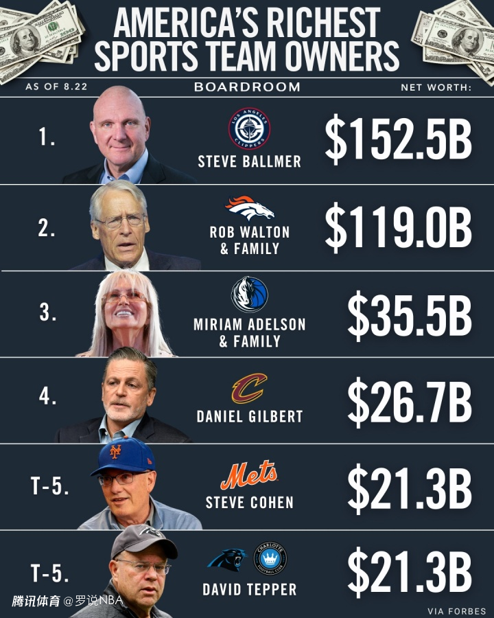 2025-08-26 06:00北京时间8月26日,美媒Boardroom援引福布斯的数据,晒出北美职业体育联盟最富有的球队老板前五榜单。快船老板鲍尔默毫无悬念地排名榜首,他目前的净资产高达1525亿美元。另有两位NBA球队的老板进入前五。