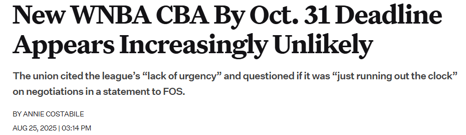 2025-08-26 06:00北京时间8月26日,据知名美媒《前线体育》报道,WNBA与球员工会仅剩60多天时间来达成一份新的劳资协议,但种种迹象表明,双方很可能在10月31日截止日前无法达成共识。