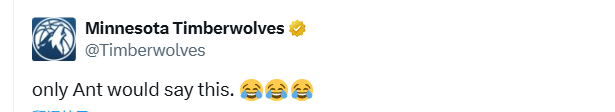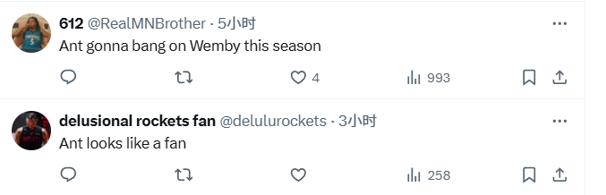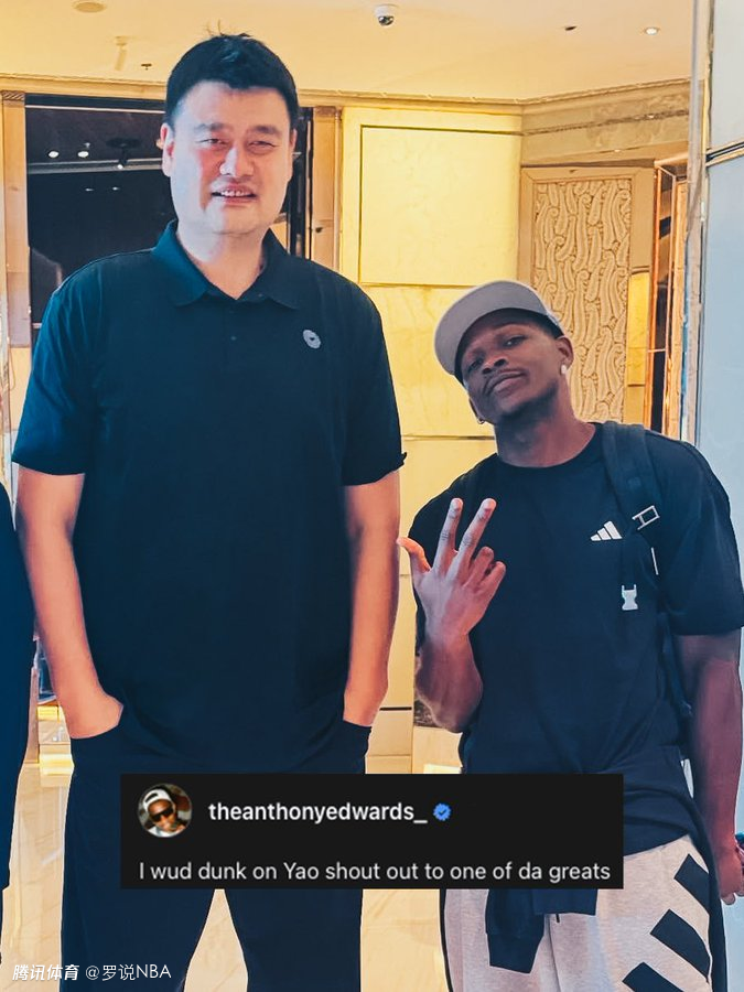 爱德华兹在社媒上晒出了一张与姚明的合影,并配文道:“我能隔扣姚明,向这位传奇巨星致敬。”森林狼官方社媒转发了爱德华兹的言论,写道:“只有爱德华兹敢这么说。”