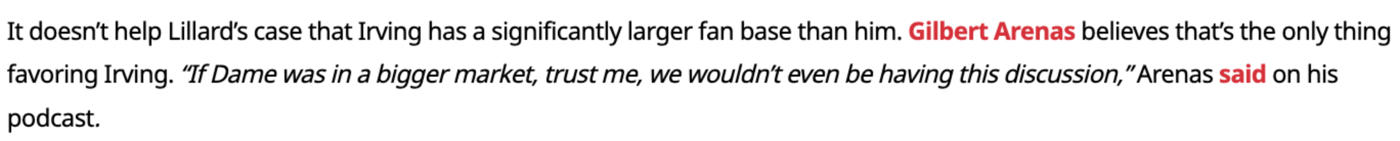 2025-08-26 10:10北京时间8月26日,近日,前NBA球星阿里纳斯在播客节目中谈到了关于利拉德和欧文的话题。