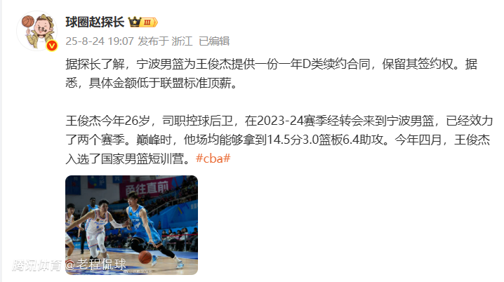 “宁波男篮为王俊杰提供一份一年D类续约合同,保留其签约权。据悉,具体金额低于联盟标准顶薪。”该媒体人在社媒上写道。