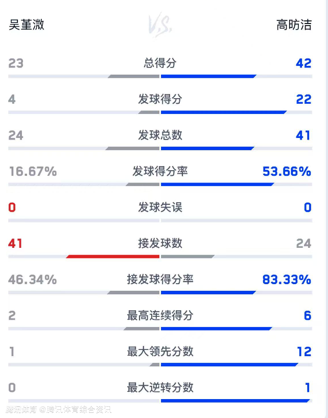 双方技术统计如下(高昉洁在前):总得分42-23、发球得分22-4、发球得分率53.66%-16.67%。