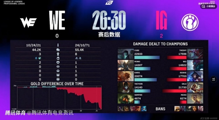 iG逐步将经济差拉开后,于25分钟果断选择大龙逼团,结果一波0换5彻底团灭WE!无需拿下大龙,iG直接从中路长驱直入,终结比赛,拿下胜利!