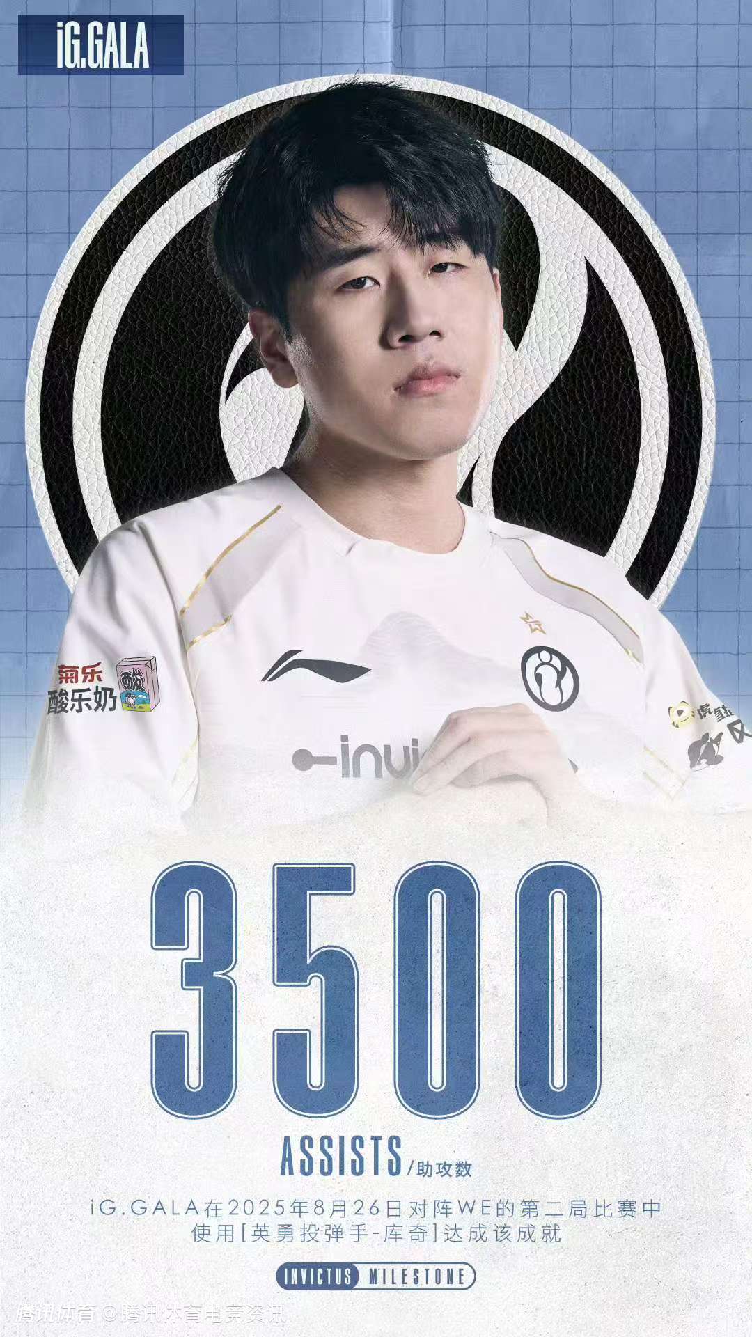 2025-08-26 21:202025年8月26日,iG与WE的激烈对决中,赛况紧张刺激,亮点频出。iG选手GALA操作英雄芸阿娜,凭借出色的赛场意识和团队协作,达成了个人职业生涯在LPL的第3500次助攻,成为LPL历史上第30位获此成就的选手。