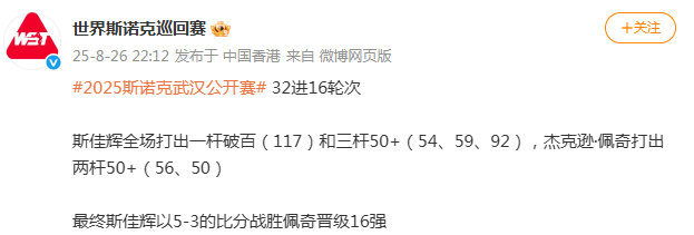 2025-08-26 22:40北京时间8月26日,在刚刚结束的世界斯诺克武汉公开赛第三轮比赛中,中国小将斯佳辉全场打出一杆破百(117)和三杆50+(54、59、92),以5-3击败佩奇挺进16强。