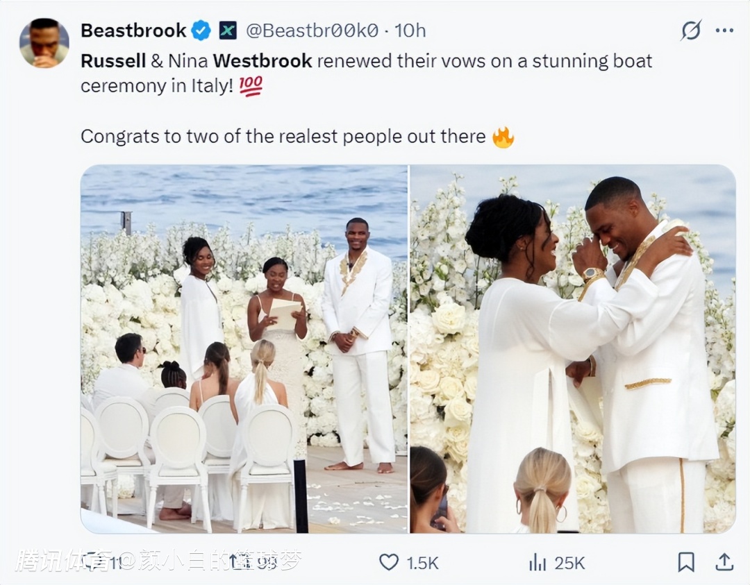 2025-08-27 07:50北京时间8月26日,威少与妻子妮娜在意大利的一艘豪华游艇上举行了结婚10周年庆典,威少与妻子妮娜是在2015年8月举行婚礼,10年后他们在海上重温了誓言,威少也落下了充满爱意的泪水。