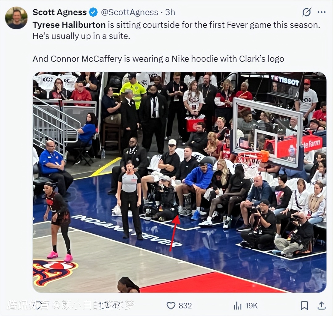印第安纳步行者记者Scott Ageness也报道,哈利伯顿坐在场边跟友人们一同观看狂热队的比赛,哈利伯顿还穿了一件印有克拉克Logo的连帽衫。【从路透照能看到哈利伯顿还是穿着保护靴】