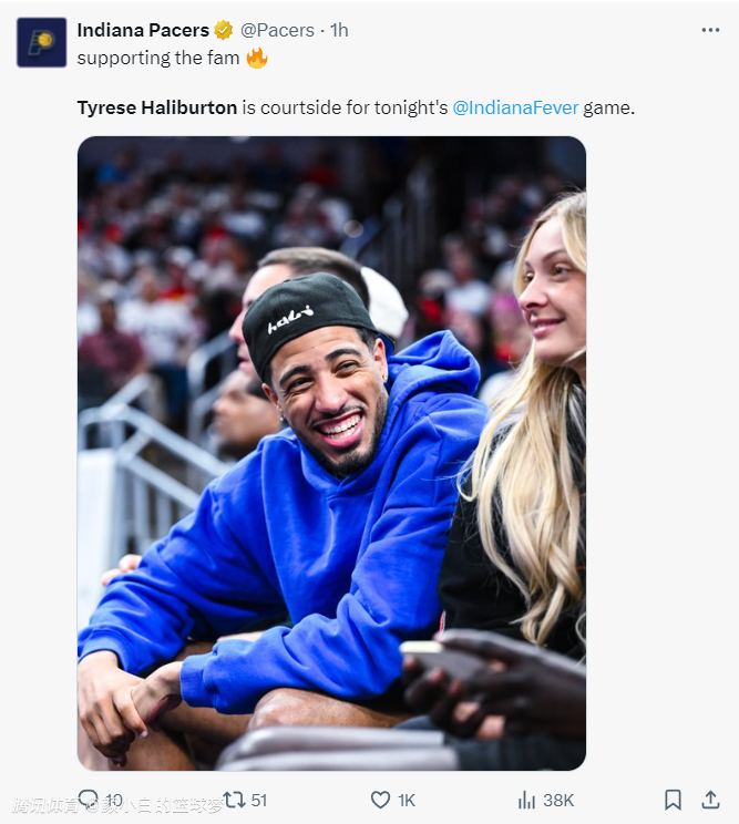 2025-08-27 11:00北京时间8月27日,印第安纳步行者队官方晒出球队核心泰雷斯-哈利伯顿坐在场边观战印第安纳狂热队比赛的图,并写道:支持家庭。