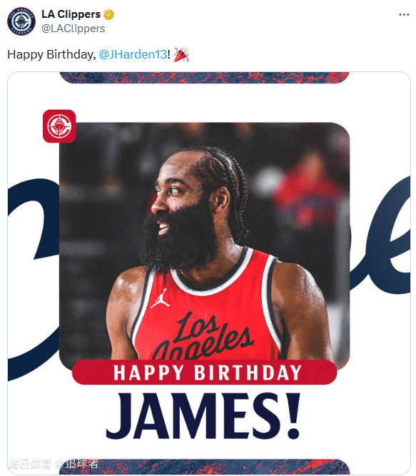 哈登36岁生日!快船官方送祝贺 美媒为他庆生:50+次数超詹姆斯