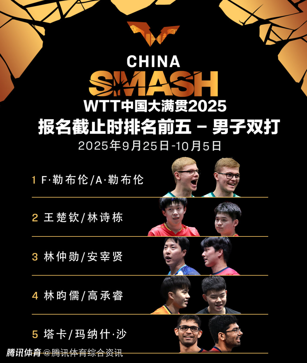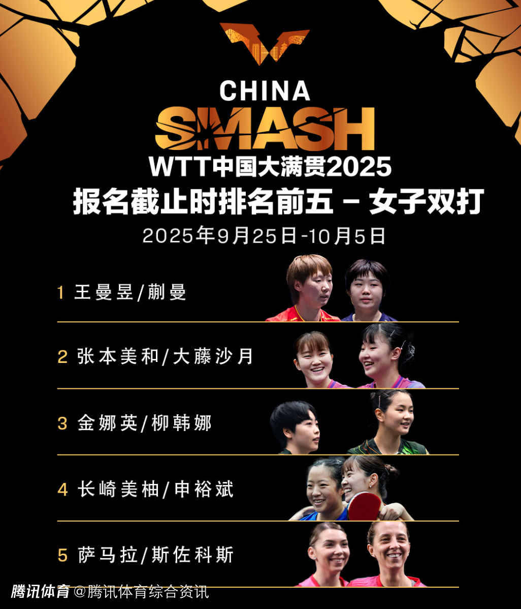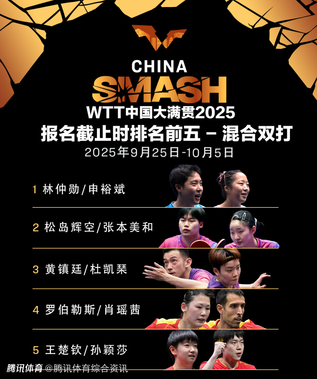 WTT中国大满贯2025将于9月25日至10月5日在北京石景山首钢园举行,冠军将获得2000点世界排名积分。报名截止时排名前五名单如下: