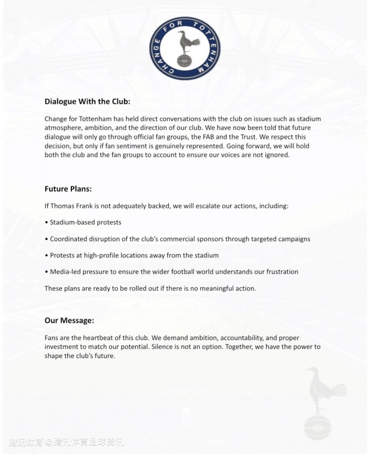 声明最后写道:“球迷是俱乐部的心脏。我们要求雄心、责任感和合理的投资。沉默不是选择,团结起来,我们有能力塑造热刺的未来。”