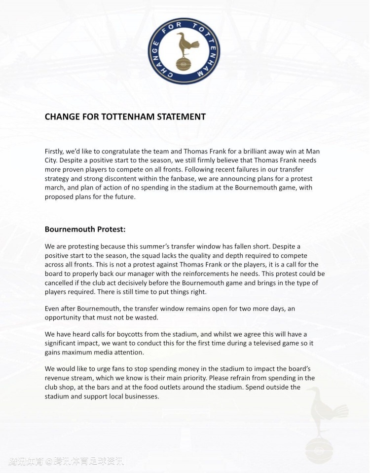 2025-08-27 13:20北京时间8月27日,热刺今夏的引援工作频频受挫,引发球迷强烈不满。球迷组织“change for tottenham”今日发布声明,宣布将在本周末主场对阵伯恩茅斯的比赛期间发起抗议。