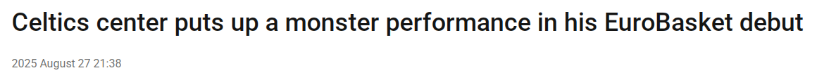 2025-08-27 22:10北京时间8月27日,在男篮欧锦赛首轮比赛中,葡萄牙男篮62-50击败捷克男篮。凯尔特人队球员凯塔在代表葡萄牙队出战的首秀中表现惊艳,他斩获23分并抢下18个篮板,拿下这场关键的小组赛首胜,同时也帮助葡萄牙队迎来了自2007年以来的首场欧锦赛胜利。