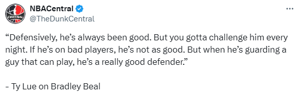 泰伦-卢表示:“比尔在进攻端能吸引两到三名防守球员,随后通过传球梳理进攻、组织球队攻势,防守端的表现同样值得肯定,只是防守效果会因对位球员不同而有差异。如果对位实力一般的球员,他的防守亮点不突出,但当他面对真正有能力的球员时,就是一名非常优秀的防守者。”