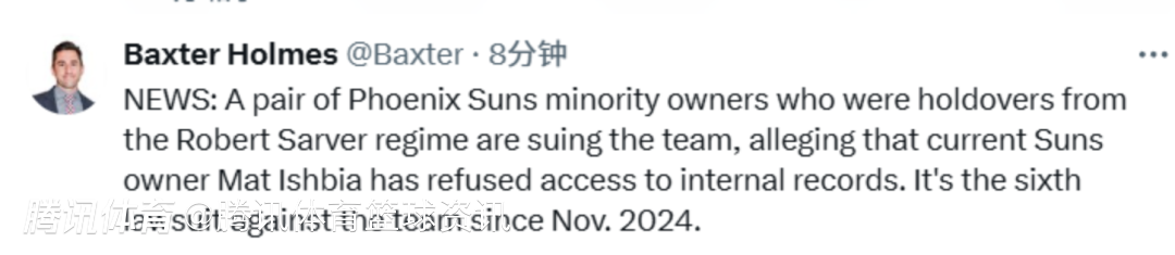 太阳两名小股东起诉球队 这是自24年11月以来针对该队的第六起诉讼