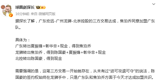 广东转出夏振锋+彰华非+现金,得到焦泊乔龙狮转出焦泊乔,得到陈国豪+夏振锋+彰华非+现金北控转出陈国豪,得到现金。