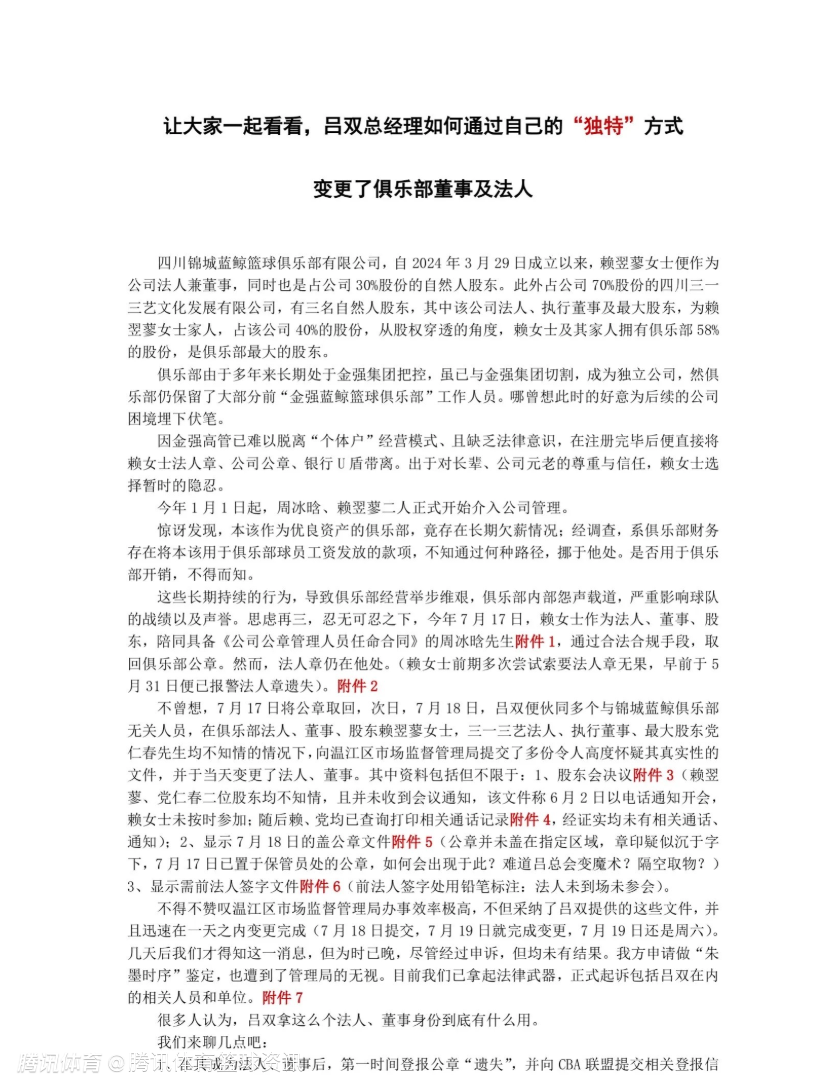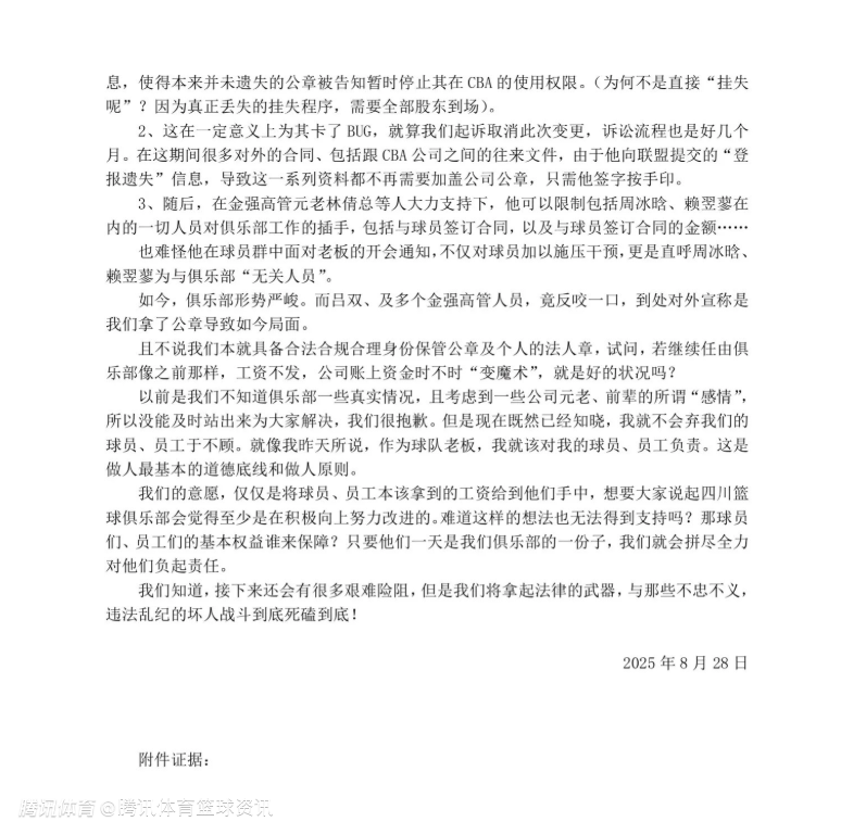 2025-08-28 16:20北京时间8月28日,据篮球记者贾磊报道,四川队小周总(周仕强之子周冰晗)晒图,控诉俱乐部总经理吕双通过“独特”方式变更了俱乐部董事及法人,导致球队公章在CBA范围内使用权被暂停,小周总表示将维护自己的合法权益,目前他已经正式起诉吕双在内的相关人员和单位。