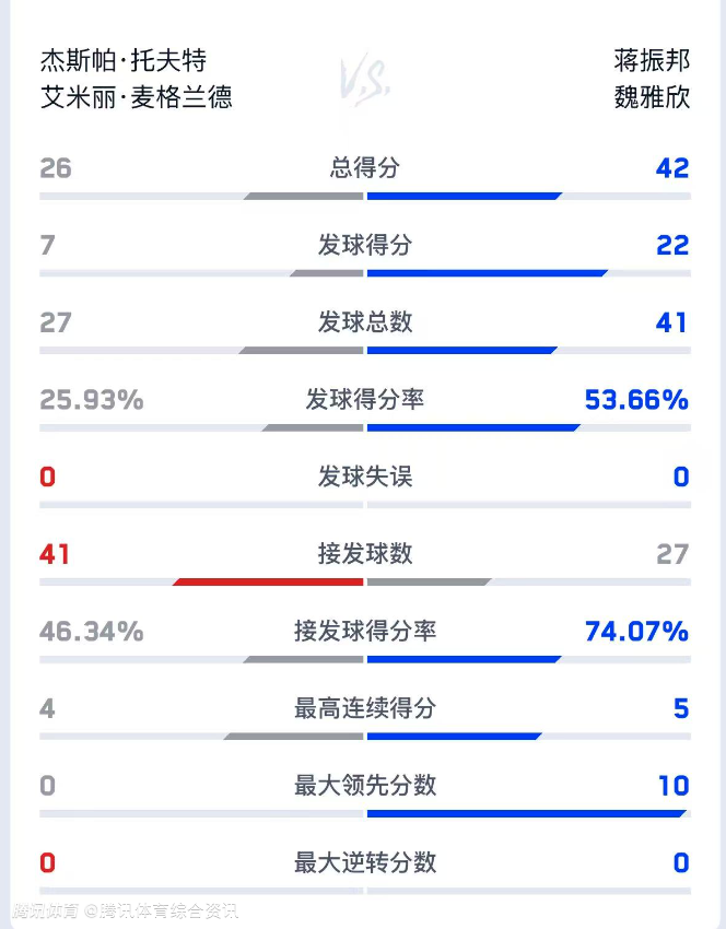 双方技术统计如下(丫邦组合在前):总得分42-26、发球得分22-7、发球得分率53.66%-25.93%。
