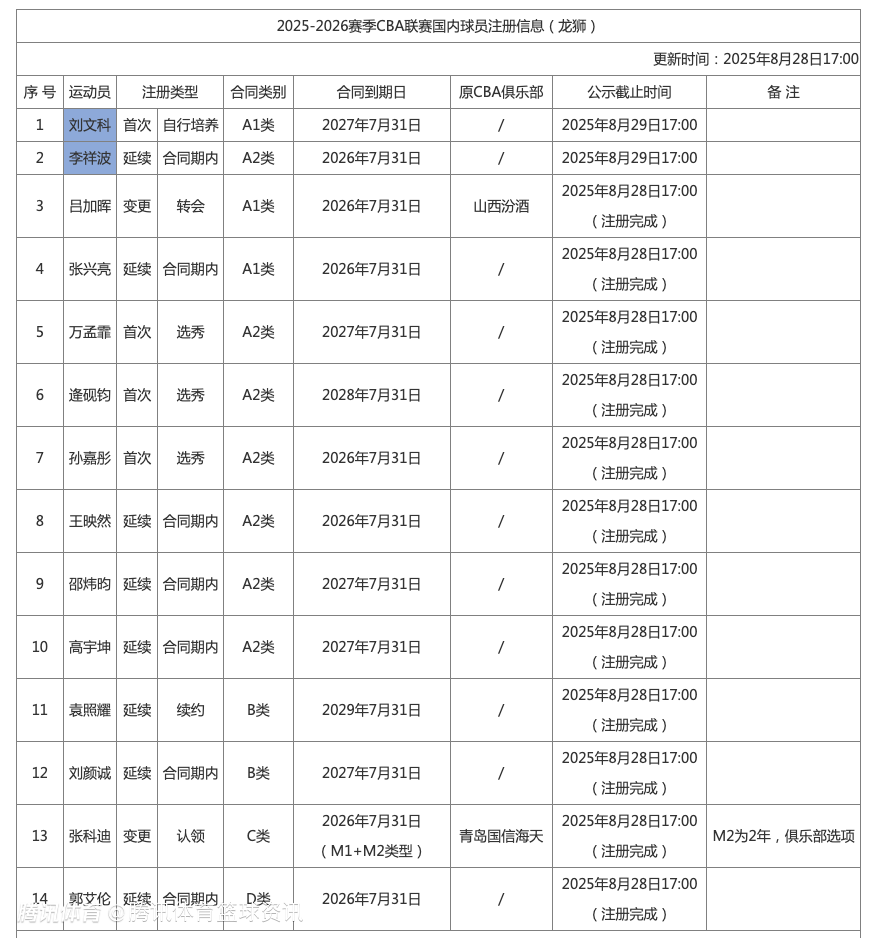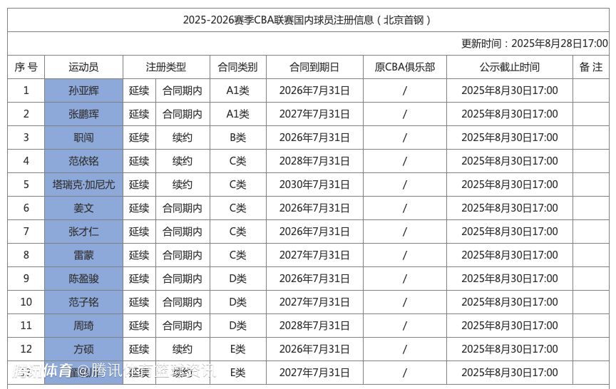 2025-08-28 19:10北京时间8月28日,CBA官网更新了多队的国内球员注册信息,北京男篮以E类老将顶薪续约了方硕、翟晓川,另外自由球员名单新增了鲁吐布拉、姜宇星等人。