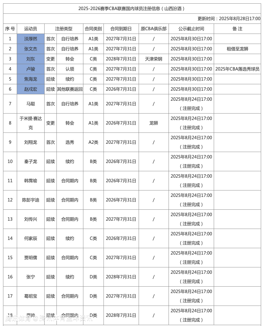 山西男篮在此前的基础上,新增了淡厚然、张文杰、刘东、卢骏、焦海龙、赵戌宏,目前共计注册了18人。