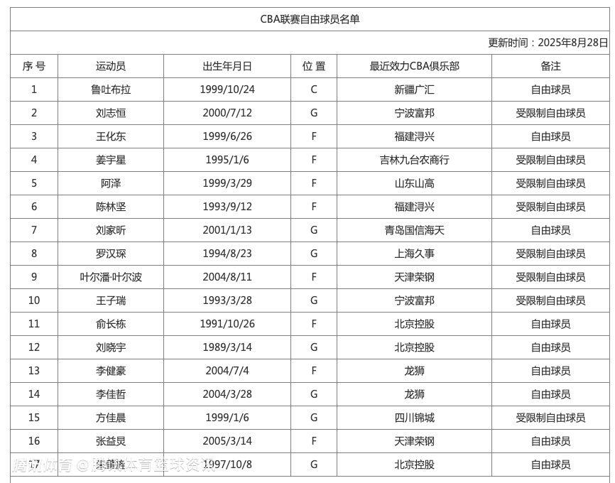 自由球员名单目前暂时有17人,包括鲁吐布拉、姜宇星等人。