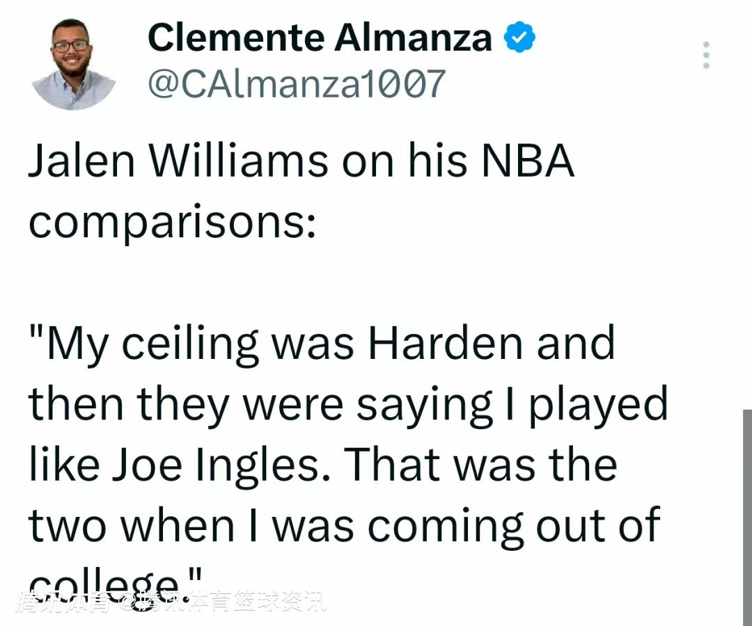 谈及外界对自己的NBA球员对比,杰威说道:“刚进联盟时,他们说我的上限是哈登,后来又说我打球风格像英格尔斯。大学毕业进入NBA那阵,大家主要就是拿这两个人和我比。”